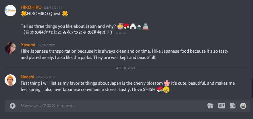 クエストとはHIROHIROが毎日送る1日15分からできる学習課題のことです。曜日ごとに英語日記・単語クイズ・リスニング・言語交換などのクエストをクリアしながら英語能力の向上を目指します。